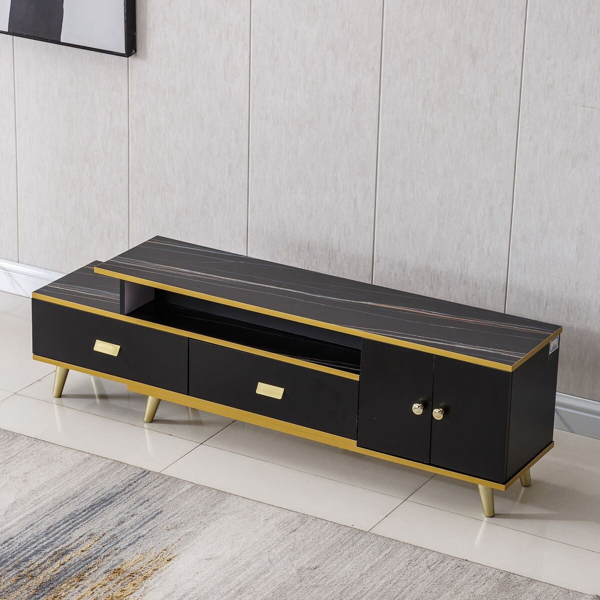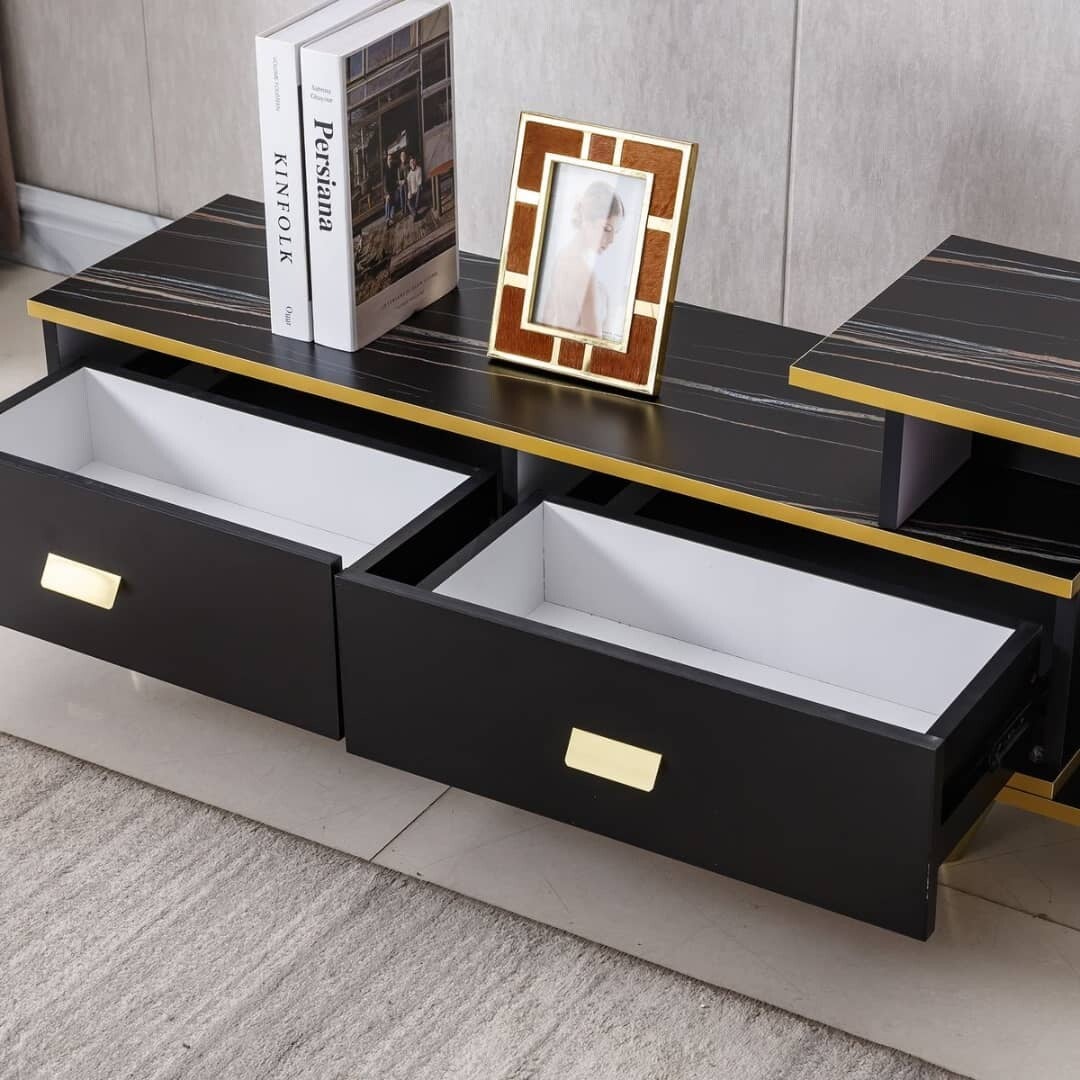 Sleek and graceful, this adjustable TV stand features the black and gold design with the clean lines and simple look. A rectangular tabletop not only can house your cable box and media player, but also can showcase art pieces, decorations, framed photos and more. The TV Stand is made of Superwood and solid wood legs, easy to clean,. Equipped with drawers, it will provide you enough space to store your books, DVDs, CDs, etc. Envelope-like pulls make it easy to open or close the drawers, this TV Stand ensures durability and brings elegance to your decor. Inject minimalist charm into your contemporary decor with this TV stand.
